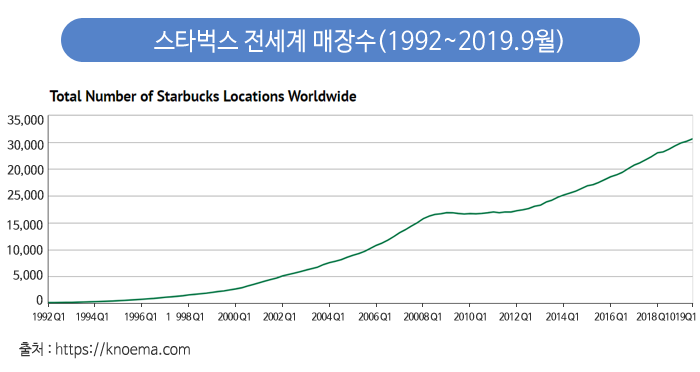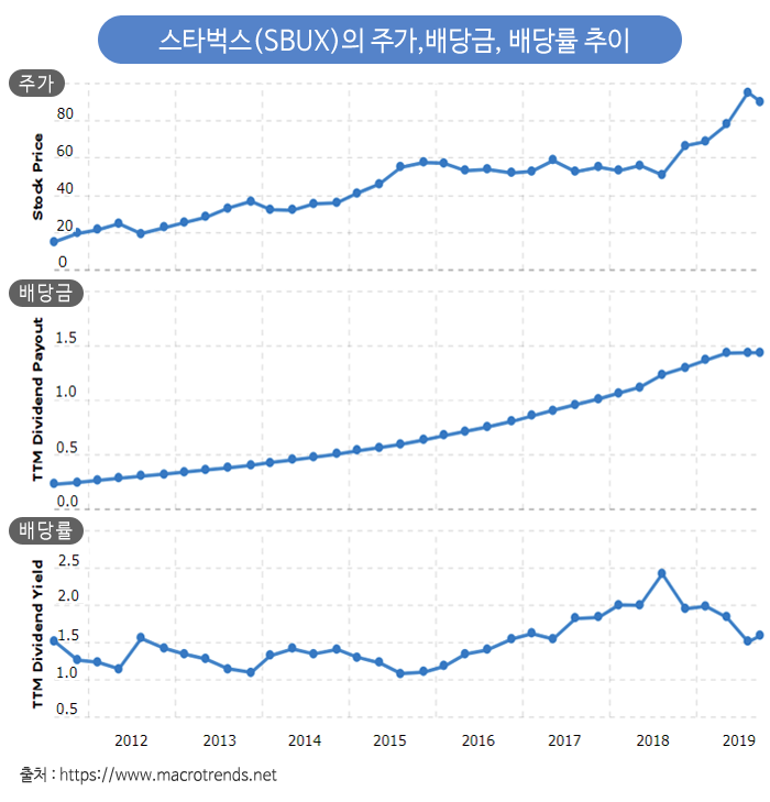위 자료는 스타벅스의 전 세계 매장수 증가 추이를 나타낸 것인데, 미국뿐 아니라 전 세계 매장수를 꾸준히 늘리고 있으며 2019년 9월 기준으로 무려 30,000개가 넘는 매장을 보유하고 있다. 도넛과 커피로 유명한 던킨의 경우에도 전 세계 10,000개가 넘는 매장을 보유하고 있으며 신흥국으로 꾸준히 확장해 나가고 있다. 이런 끊임없는 확장을 바탕으로 지속적인 수익창출을 해나가고 있으며, 주주환원 정책으로 배당금도 꾸준히 늘려가고 있다. 투자의 대가 피터 린치가 말했듯이 우리 주변의 친숙한 기업부터 투자해 나가는 것이 어떨까?