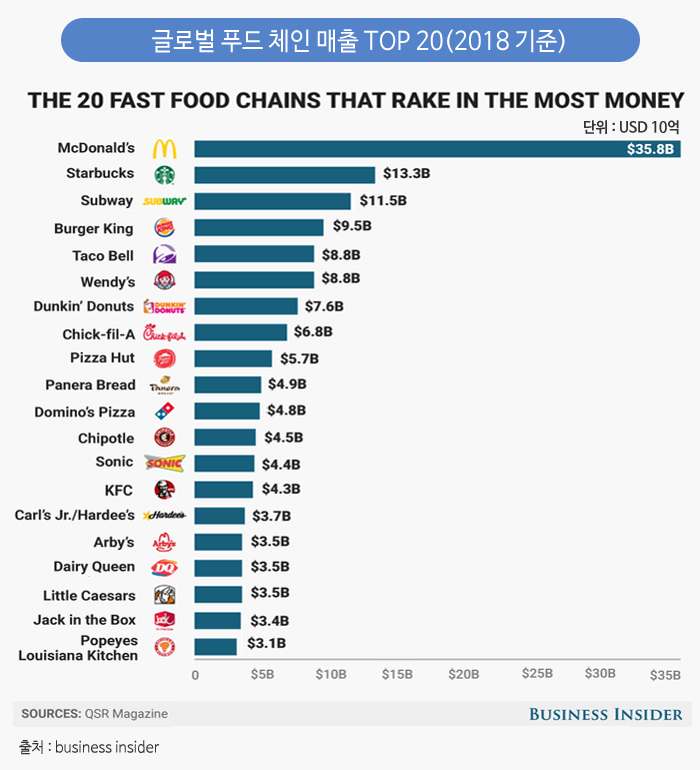 위 자료는 글로벌 푸드 체인의 매출 순위를 나타내고 있는데, 우리에게 친숙한 브랜드들이 많이 보이는 것을 알 수 있다. 맥도날드, 스타벅스, 서브웨이, 버거킹, 던킨, 도미노 피자 등 주식투자에 관심이 없더라도 한 번 쯤은 듣거나 접해봤을 만한 브랜드들이다. 이러한 브랜드를 소유한 기업들 중 개인의 성향과 기호에 맞게 선택하여 투자한다면 주주로서의 기쁨과 함께 심리적 안정까지 누릴 수 있을 것이다. 예를 들어, 스타벅스를 자주 애용하고 이를 바탕으로 스타벅스에 투자했다면 단기간 주가 하락에도 버틸 수 있는 힘이 있기 때문이다.
