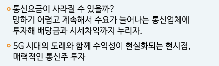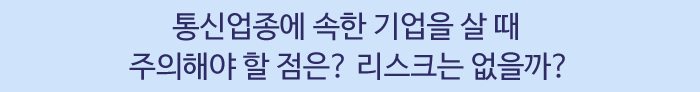 통신업종은 망하기 어려운 산업이지만 저금리 시대에 프리미엄을 받아온 건 부인하기 어렵다. 즉, 금리 상승기에는 타 업종에 비해 상대적으로 수익률이 낮을 수 있다는 점은 감안하고 투자에 임해야 한다.