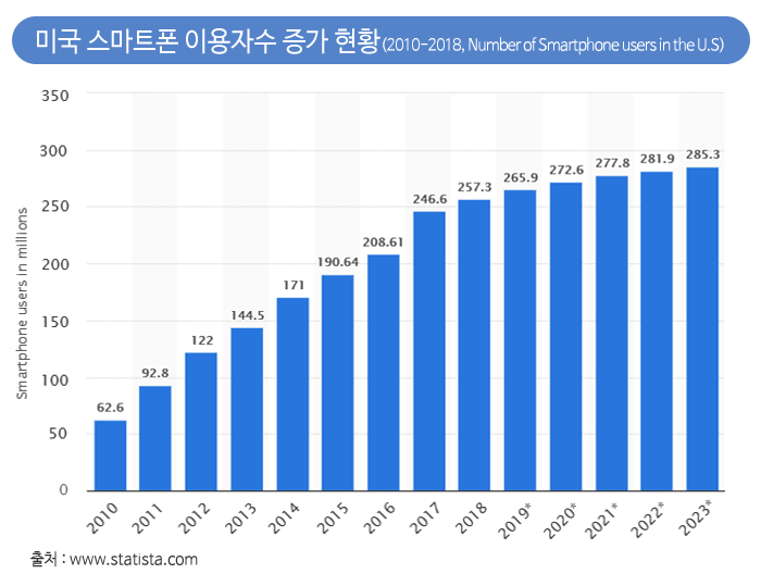 위 자료는 미국 스마트폰 이용자 수 증가 현황을 나타낸 자료다. 2019년부터 2023년까지는 추정치지만, 꾸준히 우상향하고 있음을 알 수 있다.