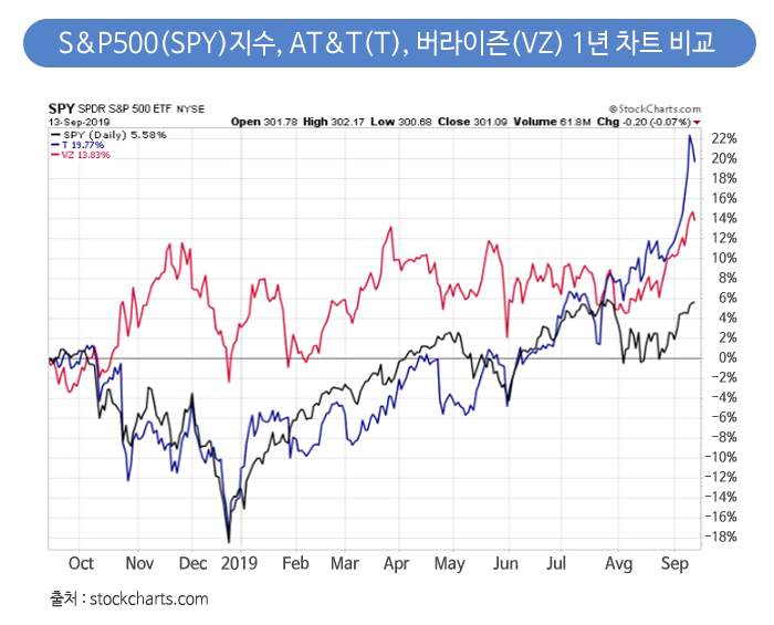 위 그래프는 최근 1년간의 S&P500과 AT&T, 버라이즌의 주가 흐름을 나타낸 자료다. AT&T는 무려 19.77%의 수익률을 내고, 버라이즌은 13.83%로 시장수익률인 5.58%를 압도적으로 초과하고 있음을 알 수 있다.