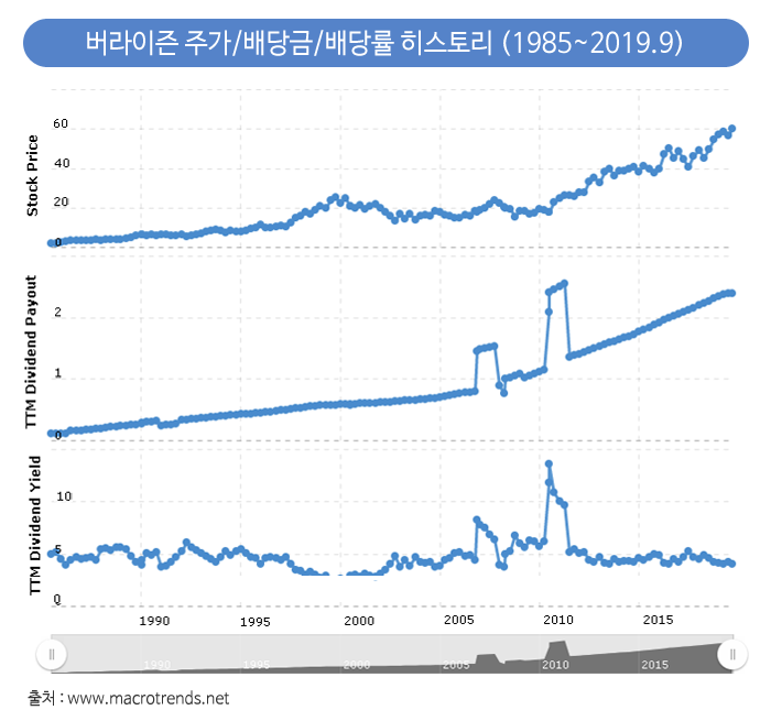 위 3개의 차트는 순서대로 버라이즌의 33년간의 주가 흐름과 배당금 증가 현황, 그리고 그에 따른 시가배당률을 보여주고 있다.