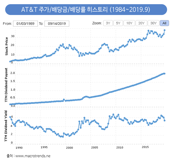위 3개의 차트 역시 순서대로 AT&T의 34년간의 주가 흐름과 배당금 증가 현황, 그리고 그에 따른 시가배당률을 보여주고 있다.