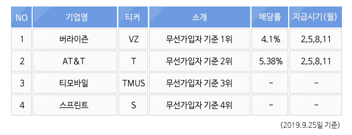 채권 금리의 2배에 달하는 4% 이상의 배당률을 지급하며 망하기 어려운 비즈니스 모델을 가진 통신 대표기업인 버라이즌과 AT&T의 매력은 계속해서 높아지고 있다.