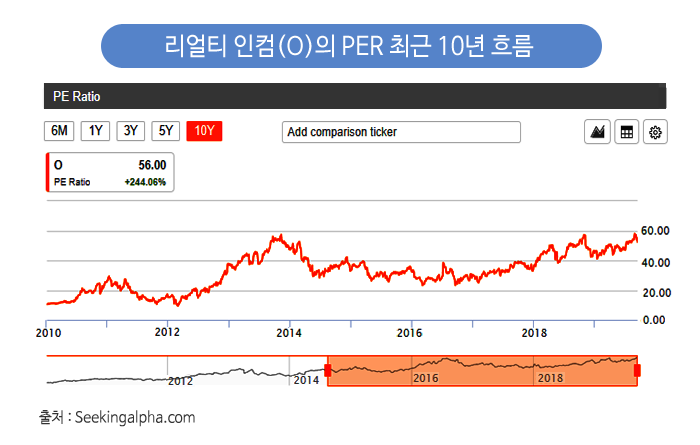 미국에서 상업용 부동산을 운영하는 리얼티 인컴(O)의 최근 10년 PER을 보면 2013년 고점 부근 PER까지 와있다(물론 리츠는 일반적으로 운영현금흐름, FFO를 기준으로 판단한다).