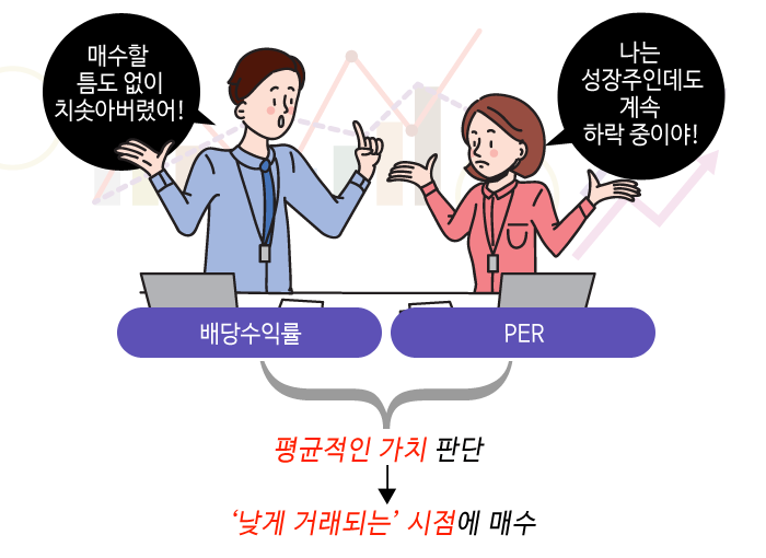 일반적으로 평균적인 가치는 배당수익률, PER 등 여러 지표를 통해 판단할 수 있으며, 이들 지표를 통해 가급적이면 평균적인 가치 대비 ‘낮게 거래되는’ 시점에 매수하도록 하자.