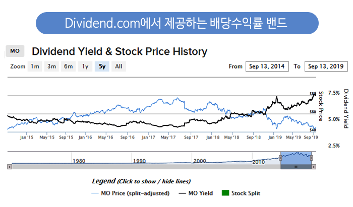 TIP) Dividend.com이나 Seekingalpha.com에서는 최근 5년의 배당수익률 밴드를 제공하고 있어 유용하게 활용할 수 있다.