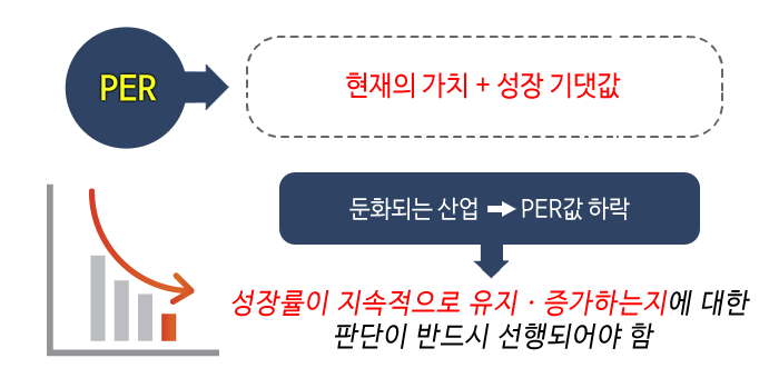시장 참여자들이 해당 산업/기업이 성장이 둔화될 것이라고 판단할 경우 PER 값이 지속적으로 우하향할 수 있으므로 앞서 밝힌 것처럼 성장률이 지속적으로 유지/증가하는지에 대한 판단이 반드시 선행되어야 한다.