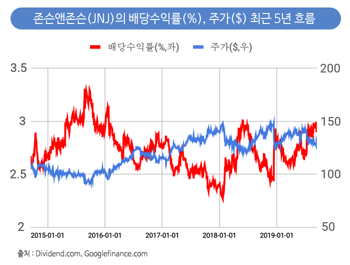 아래 그래프에서 존슨앤존슨(JNJ)의 배당수익률(%), 주가($) 최근 5년 흐름을 보면 대체로 배당수익률 기준 2.5%~3% 사이에서 주가가 움직임을 보인다.