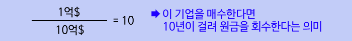 즉 시가총액이 10억$인 기업이 1년 동안 1억$를 벌어들였다면 PER은 10억$/1억$=10이 나오게 된다. 여기서 10이라는 수치를 좀 더 쉽게 이해하자면, 내가 이 기업을 매수했다면 10년이 걸려 원금을 회수하게 된다(1억$x10년)는 의미이다.