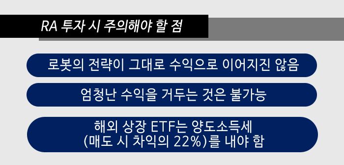 또한 많은 RA 업체들이 미국에 상장된 ETF(상장지수펀드)를 통해 자산관리를 하고 있습니다. 해외 상장 ETF는 국내 상장 ETF·펀드와 달리 양도소득세(매도 시 차익의 22%)를 내야 합니다.