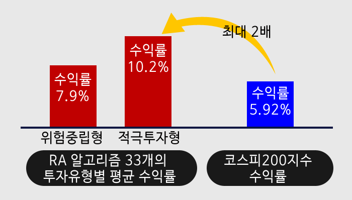 2019년 로보어드바이저 테스트베드(Test bed) 운영 사무국을 맡은 코스콤이 상품으로 출시됐거나 상품화를 준비 중인 RA 알고리즘 33개의 투자유형별(안정추구/위험중립/적극투자) 평균 수익률을 조사한 자료에 따르면 2019년 상반기 말 기준으로 RA가 투자한 위험중립형과 적극투자형의 자산 운용 수익률은 각각 7.9%, 10.2%로 코스피200지수 수익률 5.92%보다 최대 2배가량 높은 것으로 나타났습니다.