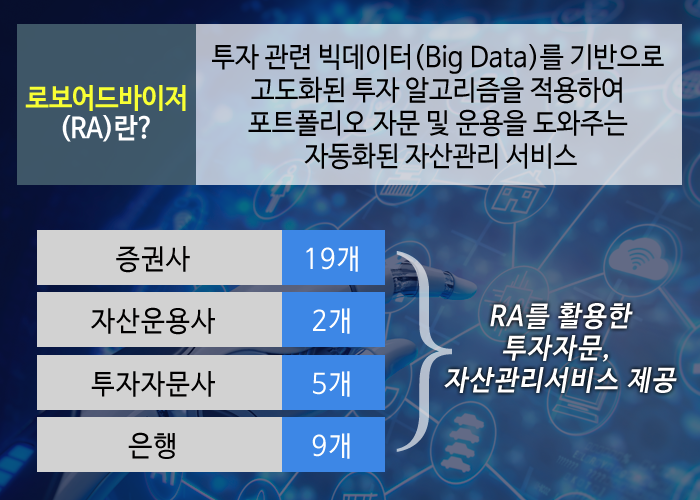 자본시장연구원의 조사에 따르면 2019년 상반기 말 기준으로 19개 증권사, 2개 자산운용사, 5개 투자자문사, 9개 은행이 RA를 활용해 투자자문 또는 자산관리서비스를 제공하고 있는 것으로 파악되고 있습니다.