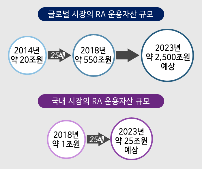 이러한 장점을 바탕으로 2014년 말 기준 20조 원에 불과했던 글로벌 시장의 RA의 운용자산 규모는 2018년 말 약 550조 원으로 25배 이상 늘었으며, 2023년에는 무려 2,500조 원 이상 규모로 성장할 것으로 전망됩니다. 국내 RA 운용자산 규모도 2018년 말 약 1조 원 규모에서 2023년에는 25조 원 규모로 25배 이상 커질 것으로 예측됩니다.