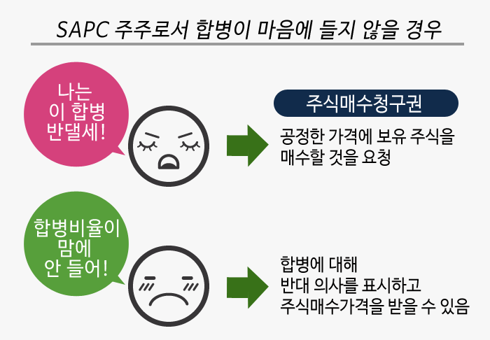만약 합병 비율이 맘에 들지 않는다든가 합병회사의 업종이나 주가 전망이 맘에 들지 않을 경우 얼마든지 합병에 대해 반대 의사를 표시하고 주식매수가격을 받을 수 있습니다.