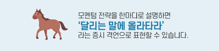 다시 말해, 모멘텀(momentum)이란 가격의 상승 탄력을 말하는데, 이 가격 상승 탄력이 강화되고 있는 주식에 투자하라는 뜻입니다.