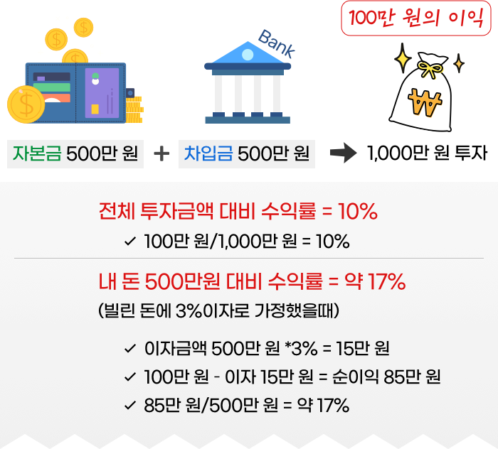 예를 들어 내 돈(자본금) 500만 원에다 빌린 돈(차입금) 500만 원을 합한 1,000만 원을 투자하여 100만 원의 이익이 났다고 가정해 봅시다.