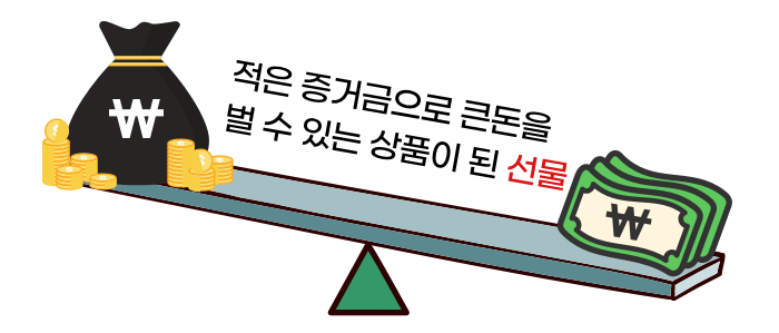 선물이라는 파생상품은 이러한 레버리지 효과로 공격적인 투자에 적합한 상품으로 환영받게 됩니다. 레버리지 효과, 즉 적은 증거금으로 큰돈을 벌 수 있는 상품으로 인식되면서 오히려 위험이 큰 투자로 적합한 상품이 된 거죠.
