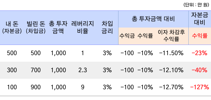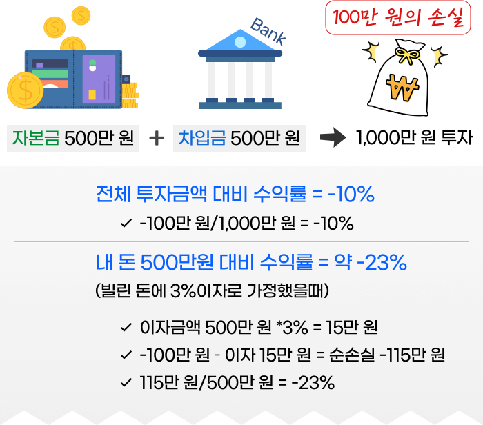 내 돈 500만 원에 빌린 돈 500만 원을 합하여 총 1,000만 원을 투자하였을 때, -10%인 상황에선 내 돈 대비 수익률은 -23%입니다.
