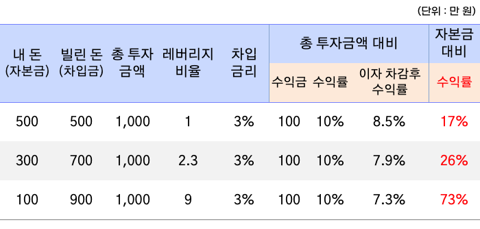전체 투자금액 대비 수익률은 100만 원/1,000만 원이므로 10%입니다. 빌린 돈에 3% 이자를 줘야 한다고 가정하고 내 돈 대비 수익률을 계산해 봅시다.