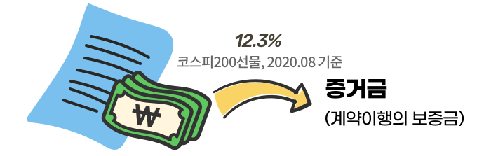 코스피200선물을 거래하는 투자자는 자신의 의도와는 상관없이 거의 8배의 레버리지 (증거금률 12.3%, 2020.08 기준)를 쓰는 것과 같습니다. 증거금이란 사전적으로는 성실한 계약이행을 하겠다는 보증금 성격이지만 투자의 관점에서는 레버리지 역할을 하고 있다는 점 꼭 명심하세요.