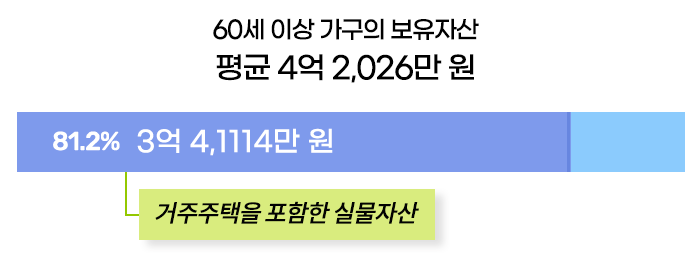 통계청이 실시한 2019년 가계금융복지조사에 따르면, 60세 이상 가구의 보유자산은 평균 4억 2,026만 원인데, 이 중 3억 4,114만 원(81.2%)이 거주주택을 포함한 실물자산으로 나타났습니다.