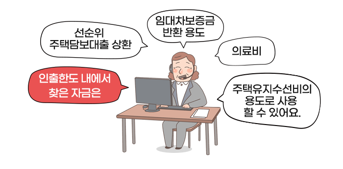 종신혼합방식과 우대혼합방식을 선택한 사람은 인출한도 내에서 찾은 자금을 선순위 주택담보대출 상환이나 임대차보증금 반환 용도, 의료비, 교육비, 주택유지수선비로 사용할 수 있습니다.