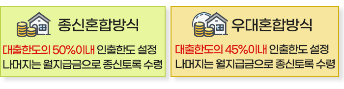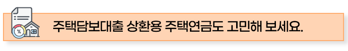 종신혼합방식 일시금 인출한도 내에서 주택대출자금 상환이 불가능하다면 주택담보대출 상환용 주택연금도 한 번 고민해 보세요. 대출한도의 90%까지 일시금으로 받아 대출상환을 할 수 있습니다.