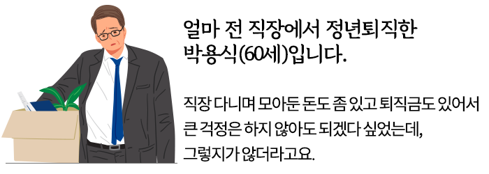 별다른 소득이 없는 상황에서 노후자금을 빼서 쓰다 보면 자금이 바닥날 것 같아 불안합니다. 게다가 국민연금공단에서 노령연금을 받으려면 아직 2년은 더 기다려야 됩니다.