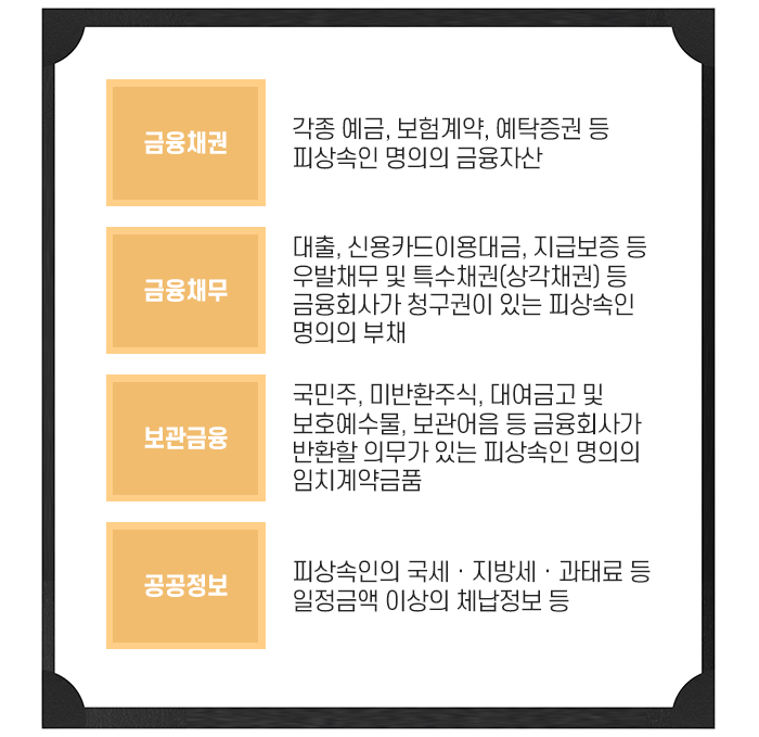 이 서비스를 신청하면, 조회 신청일을 기준으로 금융회사에 남아있는 피상속인 명의의 모든 금융채권, 금융채무, 보관금품의 존재 여부, 공공정보 등을 알 수 있다.