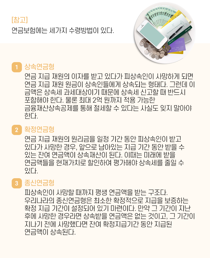 변액연금, 즉시연금, 연금보험 등은 다른 상속재산과 마찬가지로 상속의 절차를 거친다. 그런데 연금액의 지급방식이 다양하기 때문에 이를 정확히 파악하고 있어야 한다.