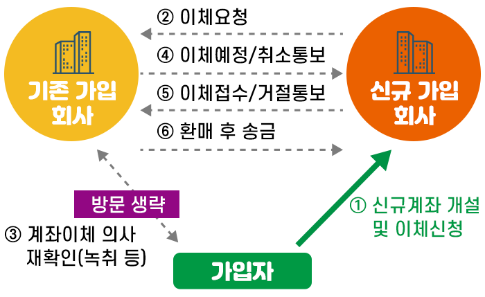 종전에는 연금이체를 하려면 가입한 금융회사와 옮기려는 금융회사를 모두 방문해야 했지만, 지금은 옮기려는 금융회사 한곳만 방문하면 됩니다.