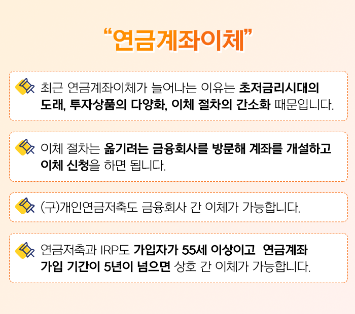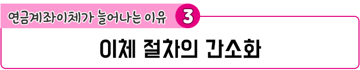 ‘관성’이든 ‘귀차니즘’이든 보통 사람들은 웬만해서 한 번 정하면 잘 바꾸지 않습니다. 그럼에도 불구하고 최근 연금이체가 늘어나고 있는데 그 이유는 무엇일까요?