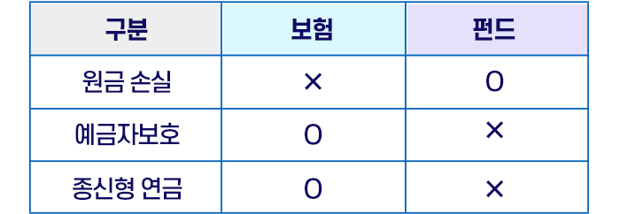 특히 보험 가입자는 5,000만 원까지 예금자보호를 받을 수 있고 종신형 연금을 선택할 수 있는데 반해, 펀드는 그렇지 못합니다.