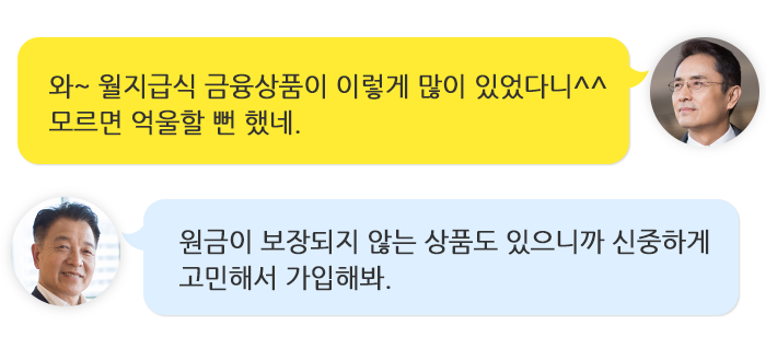 월지급식 금융상품은 연금자산이 충분하지 않은 퇴직자들에게 더욱 필요한 상품입니다. 월급처럼 매달 또박또박 입금 받기 때문에 생활비 걱정에서 벗어날 수 있기 때문입니다.