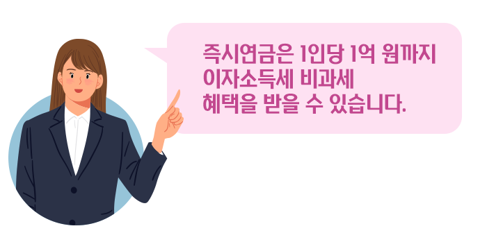 즉시연금은 목돈을 한꺼번에 납입한 후 다음 달부터 매월 연금을 수령할 수 있는 연금상품으로 1인당 1억 원까지 이자소득세 비과세 혜택을 받을 수 있습니다. 즉시연금은 지급방식에 따라 세 가지 종류로 나뉩니다.