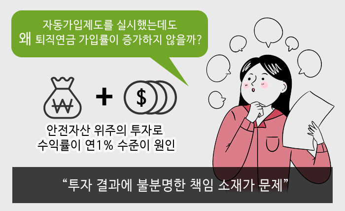 하지만 우리나라의 경우는 어떨까? 서두에 언급한 정 차장 사례처럼 대다수의 퇴직연금 가입자는 본인의 퇴직연금이 어디에 어떻게 투자되고 있는지조차 알지 못하고 있는 실정이다.