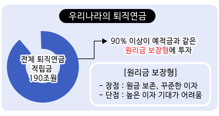 그러다 보니 전체 퇴직연금 적립금 190조 원 중 90% 이상이 예적금과 같은 원리금 보장형에 투자되고 있고 근로자의 운용지시 없이는 상품 변경조차 불가능하다.