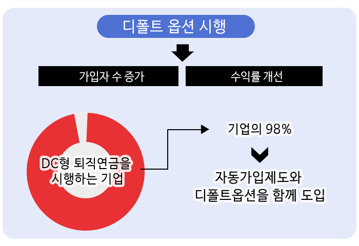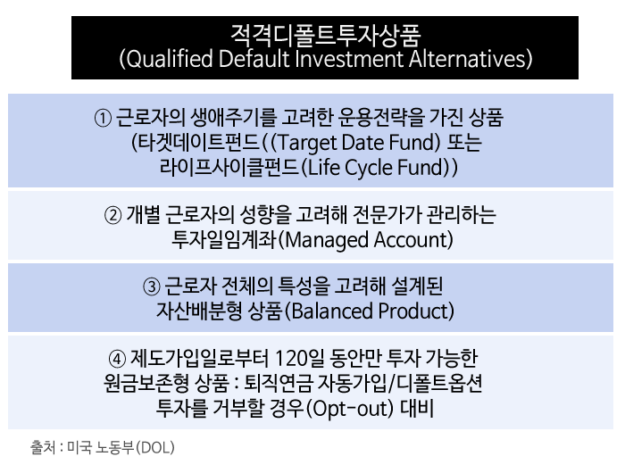 근로자의 의사를 존중하되 의사를 밝히지 않을 경우 투자할 수 있는 상품의 기준을 만들어서 제공하는 방향으로 아이디어를 발전시켰다. 그렇게 탄생한 제도가 바로 디폴트 옵션이다.