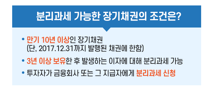 장기채권의 경우도 만기가 10년 이상인 채권을 3년 이상 보유했을 때, 33%(지방소득세 포함) 세율로 분리과세가 가능합니다.