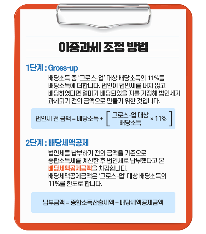 이렇게 법인세가 과세되기 전의 배당금액을 기준으로 소득세를 계산한 후 법인세로 냈다고 가정한 금액을 세액에서 공제해줘 이중과세를 조정하는 것입니다.