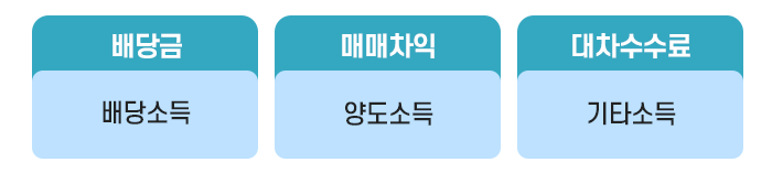 그 밖에 보유한 주식을 빌려주고 그 대가로 받는 대차수수료도 있습니다. 배당금은 배당소득으로, 매매차익은 양도소득으로, 대차수수료는 기타소득으로 구분하여 세금을 과세합니다.