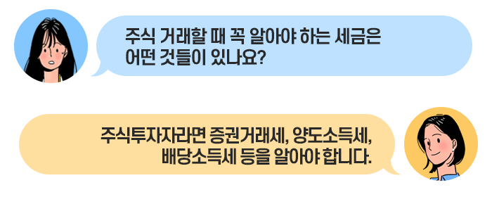 그런데 알고 보니 주식을 사면 매매 수수료가 나간다고 하더라고요. 매매 수수료 말고도 주식을 매매하다 보면 이런저런 세금도 많다고 하는데 어떤 것들이 있는지 궁금합니다.”