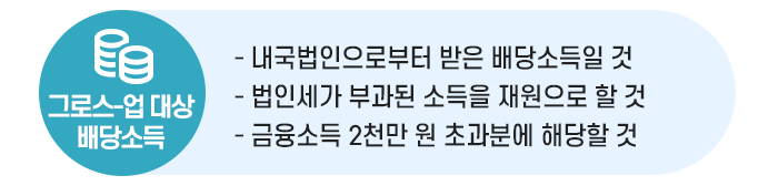 배당소득이 전부 이중과세 조정이 되는 것이 아니라 배당소득 중 아래 요건을 충족한 경우에만 ‘그로스-업’ 적용이 가능합니다.