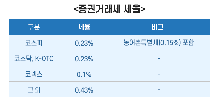 코스피시장에 상장된 주식의 증권거래세는 0.23%(농어촌 특별세 0.15% 포함)입니다. 그리고 코스닥시장에 상장된 주식과 K-OTC시장에서 거래되는 주식의 증권거래세도 0.23%입니다.