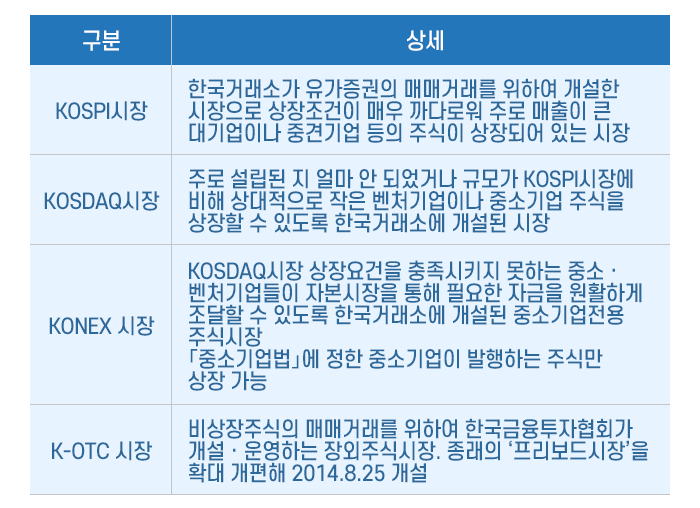 주식시장은 코스피시장, 코스닥시장, 코넥스시장, K-OTC시장 및 장외시장으로 구분할 수 있습니다.