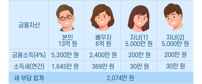 소득세 절세의 기본 원칙은 소득을 분산시키는 것입니다. 금융자산을 한 사람이 다 보유하고 있고 금융소득 또한 한 사람에게 집중되어 있다면, 금융자산 증여를 통해 절세할 수 있습니다.