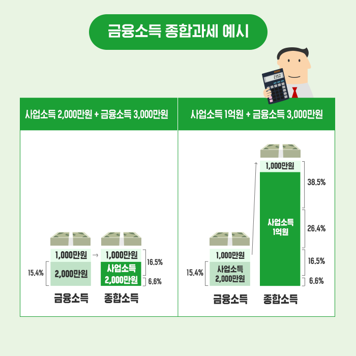 이에 반해 사업소득금액이 1억원이 된다면 이미 누진세율 38.5%(지방소득세 포함)를 적용받고 있어 금융소득 중 2,000만원을 초과하는 1,000만원에 대해서도 38.5%(지방소득세 포함) 세율이 적용됩니다. 그러므로 김씨는 금융소득에 대해서만 231만원의 세금이 추가로 발생될 수 있습니다.