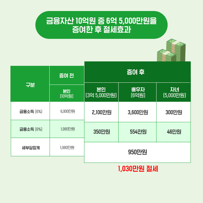 예를 들어 금융자산이 10억원(투자수익률 6%가정)이 있고 이미 다른 소득이 많아 41.8%(지방소득세 포함)의 세율에 해당하는 경우를 가정해 보겠습니다. 만약, 금융재산을 배우자와 자녀에게 증여공제 한도 내로 각각 6억원, 5,000만원을 증여하면 얼마나 세금이 줄어들까요?
