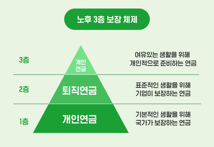 아마도 3층연금체계에 대해 들어보셨을 텐데요, 3층연금체계란 노후를 3층으로 준비하는 것으로 1층이 공적연금에 해당합니다. 공적연금은 기본적인 생활을 위해 국가가 보장하는 연금으로 국민연금과 직역연금 등, 2층은 표준적인 생활을 위해 기업이 보장하는 퇴직연금, 마지막 3층은 여유있는 생활을 위해 개인적으로 준비하는개인연금을 말합니다.최근에는 3층만이 아니라 더 다양하게 준비해야 한다고 다층연금체계가 이야기 되기도 하는 만큼 노후준비에 대한 관심도 점점 더 커지고 있는 것 같습니다.